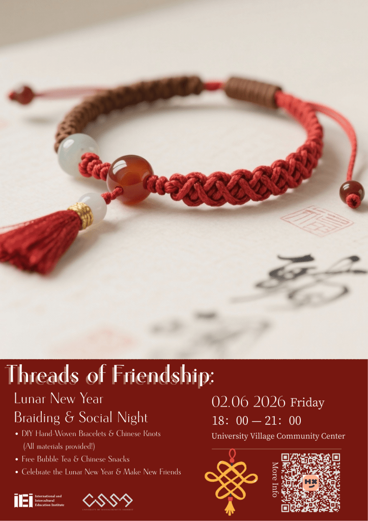 Kick off the Spring 2026 semester by joining the International and Intercultural Education Institute (IIEI) and UMass CSSA for an enchanting evening of craftsmanship and connection. As the Lunar New Year approaches, we invite you to step away from your books and immerse yourself in the vibrant tradition of Chinese knotting and bracelet weaving.